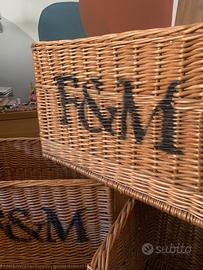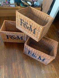 Disponibili tre ceste in vimini robusto e in ottime condizioni della nota casa inglese Fortnum & Mason Misure cm 57 x 42 - h cm 37 Il prezzo s’intende al pezzo. Se prese tutte e tre, tot € 160. Disponibile consegna Milano e hinterland con piccolo supplemento da concordare in base alla distanza.