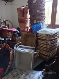 Vendo per cessata attività: 9 cesti di vimini da 2 bottiglie 10 cesti tondi diametro 25 cm con manico 6 cassette di legno da due bottiglie 12 cesti di vimini ovali (30x39) 12 cesti di vimini rettangolari (40x50) 4 cesti di vimini varie misure 18 borse regalo plasticate Mare Cristian (44x23x12) 42 borse regalo plasticate Pinetti (26*34*10) 15 cassette cartone da 6 bottiglie 3 cassette cartone da 4 bottiglie 2 cassette legno Factory 67 coccarde spessore 3 cm, rosse 48 fogli cellophane (100*130) 10 scatole cartone satinato per regalo (34*24*14) 5 cesti di vimini rettangolari (50*70*13) Mezza balla di paglia per confezioni bianca Prezzo a stock 420 euro. Telefono Fabrizio 3293174439 Sandra 3278408744