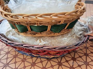 Vendo cesti in vimini e scatola rossa utilizzabili per strenne natalizie, arredo casa (portabiancheria, porta piante d'appartamento, cuccie per cani/gatti, ecc.), praticamente nuovi, completi di paglietta come da foto.