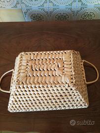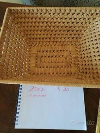 Vendo due cestini vintage, ben conservati, il primo, rettangolare, è in rafia naturale intrecciata a mano con due manici sui lati minori reclinabili: le dimensioni sono 25X20 cm + i manici sporgenti e chiudibili. Altezza 10 cm. Costo 9 euro Il secondo cestino è rotondo e lavorato con tavolette di legno collegate da fil di ferro. Le sue dimensioni: Diametro 22 cm, altezza 6 cm. Costo 5 euro.