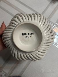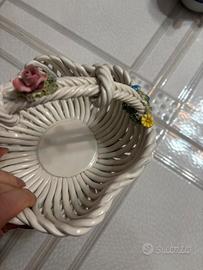 Vendo cestino in ceramica lavorata a intreccio, ispirato allo stile artigianale di Bassano. Decorato con finiture smaltate e dettagli realistici, è perfetto come centrotavola o oggetto decorativo. Adatto per contenere piccoli oggetti o come elemento estetico.