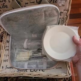 Vendo cestino da picnic di vimini completo di stoviglie (4 piatti in ceramica, 4 cucchiai forchette e coltelli in metallo, 4 calici in plastica, saliera e pepiera, apribottiglie cavatappi. Interno con cerniera e foderato di isolante termico per mantenere freschi cibi e bevande.