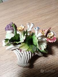 Cestino di fiori piccoli, boccioli di rose e foglie tutta porcellana ottima fattura, manico rotto ma non si nota