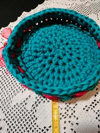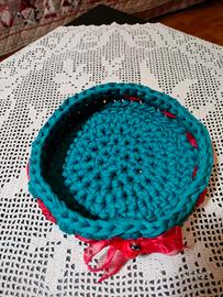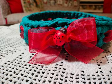Vendo cestino realizzato all’uncinetto con fettuccia sintetica, decorato con nastro acrilico rosso e una piccola coccinella applicata.