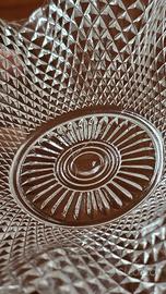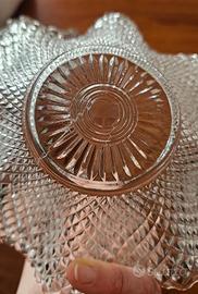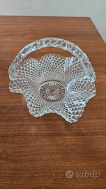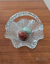 Cestino in vetro, con manico. Spesso e trasparente. Lunghezza totale 16,5 cm. Lunghezza manico 15 cm. Diametro base 6,5 cm. Utilizzabile come soprammobile, svuota-tasche, per pietanze o caramelle. Difetto= all'interno, la base presenta dei graffi, come visibile dalle foto. (Uova vendute separatamente).