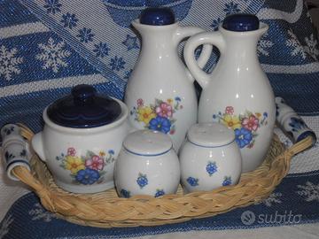 Grazioso cestino in vimini, nuovo mai usato, contenente ampolle in ceramica per olio, aceto, sale pepe e spezie. Vendo a euro 10,00 -