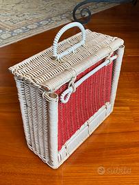 Originale senza alcun difetto. Cesto, cestino, valigetta in vimini completo degli accessori, alcuni in plastica, altri anche in metallo, come da foto. Ideale per auto d'epoca come la Fiat 500, Topolino, Maggiolino, Maggiolone, Autobianchi Bianchina Fiat 600, Fiat 1100, A112, Citroen 2CV, Renault 4 ecc.