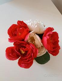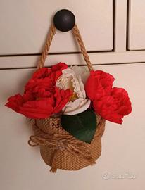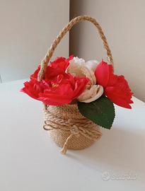 Cestino Juta da appendere con Fiori Artificiali bianco/rossi Misure Base 9 cm Altezza ( senza fiori) 8,5 cm.