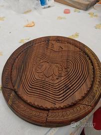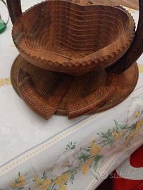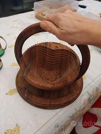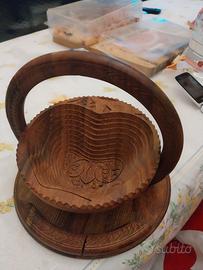 Cestino in legno intarsiato che si apre e si chiude appiattendisi. Con manico. La listella alla base (che non fa parte del cestino) è rotta come da foto. il resto è perfetto