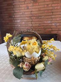 vendo splendida composizione pasquale realizzata interamente a mano, perfetta come centrotavola o idea regalo originale. il cestino è ricco di dettagli primaverili e simboli della pasqua.