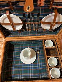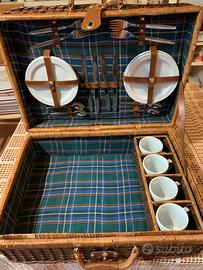 Cesto per picnic con inclusi un set di 4 piattini, 4 coltelli ,4 forchette, 4 cucchiaini e 4 tazze. Per una gita fuori porta o in giardino a casa di amici. C’è spazio per il cibo o altro. Ottime condizioni, mai utilizzata.