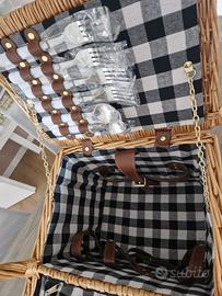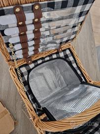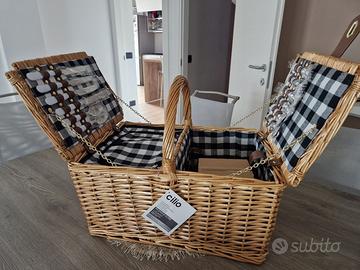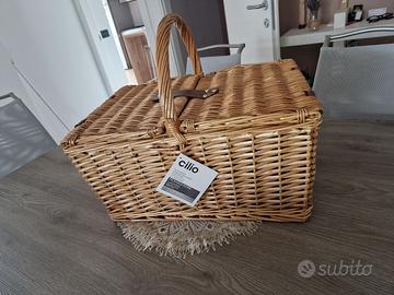#Idealeinprimaveraestate. Cesto da Picnic di marca Cilio, nuovo, mai usato. Serie LUGANO. Materiale: Vimini Colore: marrone chiaro. Tipologia: Cesto Dimensioni (LxPxH): 48x32x25cm Ideale per momenti all'aria aperta, munito di scomparto termico dedicato. Realizzato in robusto salice intrecciato, completo di tutto il necessario per quattro persone, inclusi cucchiai, coltelli, forchette, bicchieri e piatti.