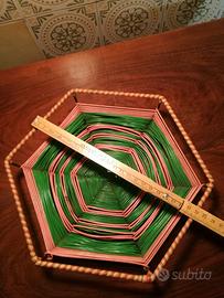 Allegro Cestino porta frutta/pane vintage, intrecciato con cordino in plastica scoubidou colori verde e rosa nel corpo centrale, arancio e bianco nel bordo. La struttura è in metallo con qualche segno di ossidazione, il cordino in plastica è allentato in certi punti. Si usavano negli anni '70 e oggi può dare un allegro tocco vintage alla cucina. Può essere utilizzato come porta frutta, porta pane, o come contenitore per tutto quel che si vuole. MISURE: 24X26 cm