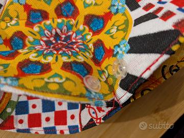 Grazioso ed originale cestino in stoffa tema carretti siciliani ideale per uova e pane. Utile anche per organizzare piccoli oggetti o centrotavola per frutta secca cioccolatini e caramelle. I cotone e e poliestere lavabile 100% Dotato di automatici per salvaspazio quando non si usa. Ottimo anche come sottopiatto o centrotavola.