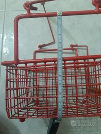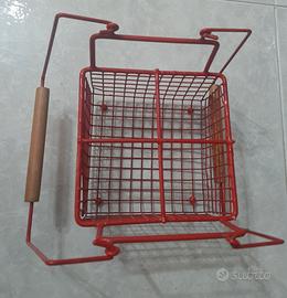 Cestino in filo di ferro rivestito in materiale di colore rosso con manici in legno. Ha 4 scomparti per portare agevolmente lattine o bottigliette piccole. Misura 15,7 cm, gli scomprti sono alti 8 cm. Misura come in foto piedini inclusi 16 cm, con i manici alzati circa 29,5 cm. Pesa 255 gr. Nelle pieghe dei bracci il rivestimento rosso si è un po' tolto.