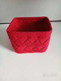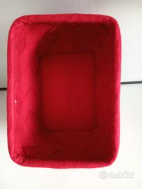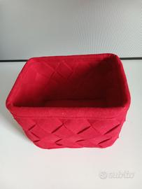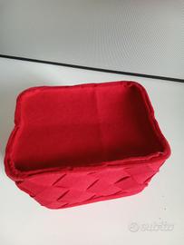 Cestino portaoggetti di colore rosso a base rettangolare fatto con strisce di feltro intrecciate. Misure cm.22 per 16, altezza cm.18,acquistato in Alto Adige,ancora come nuovo.