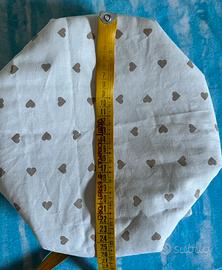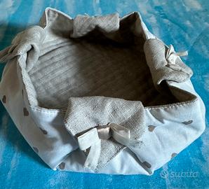 Vendo cestino di stoffa per pane Nuovo da tavola, mai usato, mai lavato, color bianco e beige con cuoricini nella copertura esterna e 4 fiocchi per stabilizzarne l’apertura. Misure 26x26 cm.