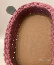 Cestino con base in legno ricoperta con similpelle marrone chiaro, bordo fatto all’uncinetto color blush con filato bobbiny, ideale come svuotatasche o portaocchiali. Dimensioni 15x 20 cm circa.