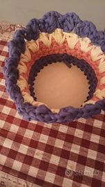 Cestino tutto fatto a mano con uncinetto in fettuccia con base in legno ottimo come porta oggetti o porta pianta Misura 14 cm diametro e 10 cm altezza Disponibile su richiesta a realizzare in altre forme e colori