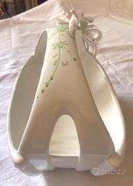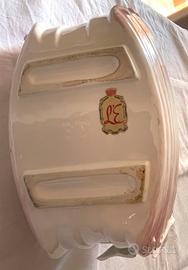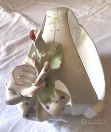 Elegante cestino contenitore in pregiata porcellana bianca, caratterizzato da una raffinata lavorazione traforata che simula l'intreccio di un canestro. L'oggetto è impreziosito da dettagli floreali a rilievo (roselline) e delicati profili in oro zecchino sui bordi e sul manico, che ne esaltano lo stile romantico e senza tempo. Versatilità d'uso: Splendido come centrotavola. Ideale come porta caramelle o cioccolatini in salotto. Perfetto come piccola fruttiera o elemento decorativo per una tavola raffinata. Ottima idea regalo per amanti dello stile Shabby Chic o del vintage classico. Dimensioni e Peso: Altezza: 15,5 cm Larghezza: 15,5 cm Lunghezza: 27 cm circa Peso: 708 gr Condizioni: Oggetto vintage in ottime condizioni, come mostrato nelle foto dettagliate. Non presenta sbeccature o crepe evidenti; le decorazioni dorate e i fiori in rilievo sono ben conservati. Spedizione: Imballaggio accurato e protettivo garantito per preservare l'integrità della porcellana durante il trasporto.