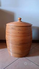 Cesto contenitore cilindrico di grandi dimensioni in vimini e rattan, bello in un bagno per la biancheria o per tenere le coperte vicino ad un divano. È vintage risalente agli anni 70 e nel web trovate informazioni e dettagli aggiuntivi. Misure in foto, segni del tempo ma complessivamente è in buono stato