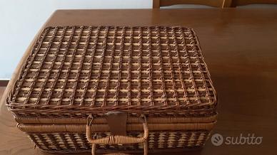 In vimini anni '60, mai usato con servizio completo in plastica bianca, rigida e spessa per 4 persone. L'interno è foderato con una fantasia a quadretti bianchi e blu come la tovaglia ed i tovaglioli. Contiene : 1 tovaglia cm 104x104; 4 tovaglioli cm. 33x33; 4 piatti piani, 4 bicchieri, 4 cucchiai, 4 forchette e 4 coltelli seghettati.