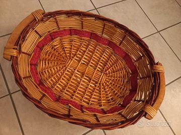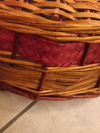 Cesto di vimini ovale con nastro bordeaux intrecciato e manici. Può andare bene per la biancheria, come cuccia o per bomboniere. Misure dall'alto 65 cm x 49 cm. Misure alla base 47 cm x 34 cm