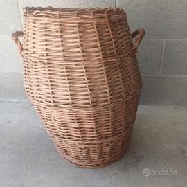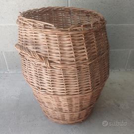 Vendo bellissimo cesto artigianale in vimini intrecciato, caratterizzato da una forma alta e slanciata. Il cesto è robusto, dotato di due pratici manici laterali e si presenta in buone condizioni generali. 55x30 cm