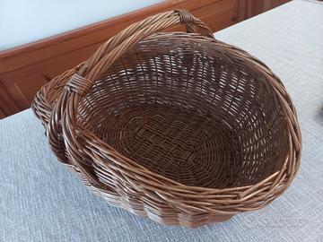 Vendo bellissimo cesto in vimini intrecciato, solido e capiente, con manico centrale. Ideale come cesto da picnic, porta-legna, porta-pane o come elemento decorativo per casa di campagna o arredamento rustico.