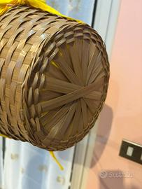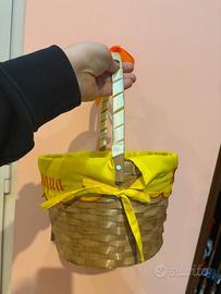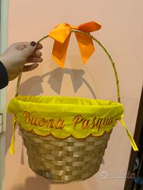 Delizioso cesto pasquale in vimini intrecciato (o bambù), perfetto per decorare la casa durante le feste o per la caccia alle uova! 🐣 - Fodera interna in tessuto giallo con ricamo “Buona Pasqua” - Bordo festonato decorativo - Manico ad arco robusto, decorato con un elegante fiocco arancione - Ideale come centrotavola o porta ovetti/regali - 📏 Dimensioni circa •Diametro: circa 25 cm •Altezza totale (con manico): circa 33 cm 🧺 Condizioni: nuovo senza cartellino Perfetto per creare un’atmosfera pasquale allegra e colorata! 💛