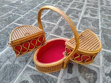 Cesto per accessori cucito, vintage in buone condizioni,in vimini e paglia di Vienna rattan, rivestimento interno in tessuto rosso. Vendo a 50 euro.