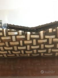 Elegante cesto rettangolare, intrecciato, di colore beige-marron. Dimensioni: 50x37x12 cm.
