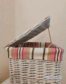Cesto portabiancheria in vimini bianco con sacchetto multicolor interno estraibile,coperchio amovibe.