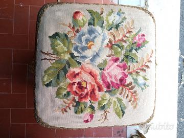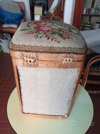 Cesto portabiancheria o altro , struttura in bambù, rivestito in tela sacco lino con copricesto ricamato a punto e croce . In ottime condizioni il ricamo ,mentre il copricesto è agganciato solo da una parte . Misura 30x30x47