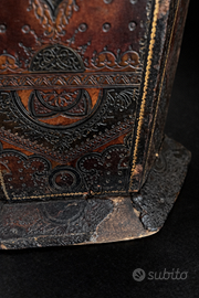 L’oggetto presenta una struttura lignea interna con rivestimento esterno in cuoio lavorato e decorato, con profili evidenziati e base sagomata.