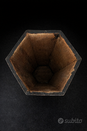 Cesto di forma esagonale, realizzata in legno rivestito in cuoio decorato a motivi geometrici e floreali di gusto orientale, riconducibile ad area sino-tibetana.
