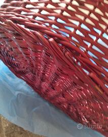 Vendo come foto, cesto in vimini color rosso, in vimini, largo 50 cm, alto 16, con il manico arriva a 45 cm. ideale per natale o per cesto regalo. Si preferisce consegna a mano