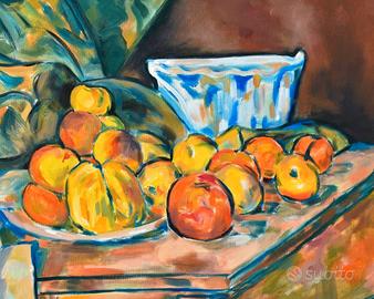 Copia di "Natura morta con mele e pesche" di Cèzanne, del 1905. Realizzata da me nel 2021 (Bonghi @sbongaz) Olio su tela, 100x80cm, 2021.