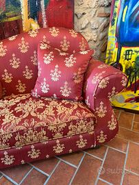 Divano Chaise Longue versione destra come nuovo con cuscino tubolare e cuscino, rosso con gigli dorati piedini in legno.