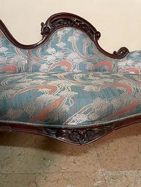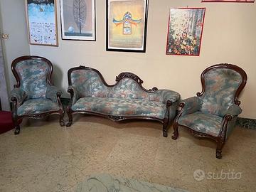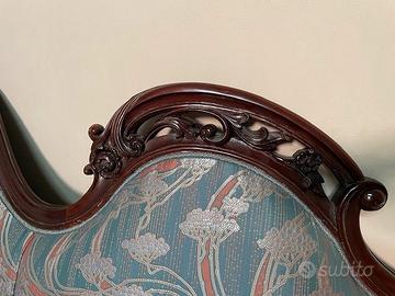 Chaise longue e coppia poltrone liberty imbottitura ottima e tappezzeria in seta fiorentina con difetto solo sulla seduta delle poltrone, vedibile in foto, mentre le zone più chiare sono riflessi della luce sulla seta