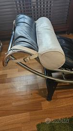 Chaise longue di pelle nera vintage stile "Le Corbusier" imitazione di quella di Cassina in struttura cromata, inclinazione variabile con culla in acciaio cromato lucido, piedistallo in acciaio e poggiatesta in pelle bianca con imbottitura in poliestere misure: lunghezza 170cm larghezza 48 altezza 60cm , ritiro a carico dell' acquirente.