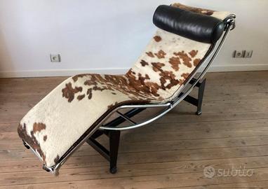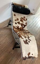 Elegante e bellissima poltrona LC4 produzione di MDF ITALIA Milano- design di Le Corbusier. Seduta in morbido pelo di cavallino maculato, e cuscino poggiatesta superiore in pelle nera. La poltrona si trova in uno stato Perfetto ECCELLENTE stato di conservazione. Modello 1401 a Catalogo MDF ITALIA .