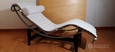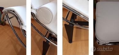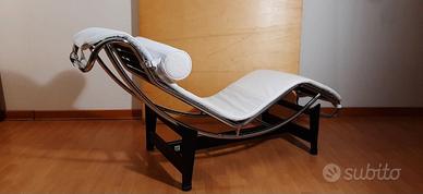 Chaise Longue LC4, prodotta da MDF Italia Milano, un’icona del design moderno disegnata nel 1929 da Le Corbusier, Pierre Jeanneret e Charlotte Perriand. Realizzata nella versione in cuoio bianco. La struttura del basamento ad “H” è rifinita in nero, mentre la culla è in tubolare Mannesman con una finitura cromata a specchio, completata da eleganti cinghie nere. Questa Chaise Longue è in Condizioni OTTIME, pari al nuovo, essendo stata utilizzata esclusivamente in un corner espositivo. Fa parte della serie Grandi Maestri del design del ‘900 ed è inclusa nel catalogo MDF Italia (pagine 59, 60 e 61, codice 1401). MDF Italia, all’epoca terzista di Cassina, è stata acquisita da quest’ultima nel 2013. Misure: Larghezza 60 cm, Profondità 160 cm, Altezza 65 cm, Altezza seduta 40 cm. SPEDIZIONE POSSIBILE ad costo di trasporto e consegna a 300 eu su Lazio-
