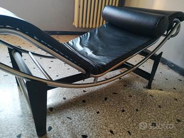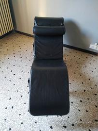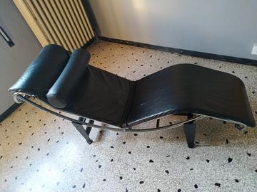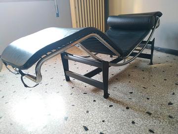 Copia della famosa Chaise Longue Le Corbusier, dal design unico ed intramontabile. Struttura in acciaio cromato, base in metallo e finitura in color nero. Seduta reclinabile rivestita in pelle nera. Stile imponente ed elegante, ideale per ambienti come soggiorno o studio. Buone condizioni.