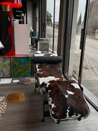 Prodotto di design rivestito in pelle cavallino pezzato, struttura cromata, inclinazione variabile con culla in acciaio cromato lucido, piedistallo in acciaio e poggiatesta in pelle nera.