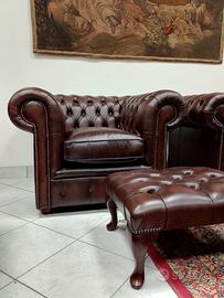 Divani e poltrone chesterfield ( chester ) inglesi originali nuovi realizzati artigianalmente in Inghilterra secondo la tradizione chester inglese, attraverso l' utilizzo di pelle bovina di pieno fiore tamponata e stonalizzata a mano. Nella fodera sottostante il cuscino è cucito il certificato di provenienza. La struttura interna in massello di faggio sostiene una morbida imbottitura interna e il rivestimento in pelle sulla superficie. La tipica lavorazione a capitonné fissata nel fondo dai bottoni tirati a spago decora gli schienali arricciati, mentre borchie in metallo applicate singolarmente e cordoncini in pelle contornano i profili.