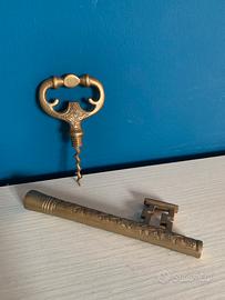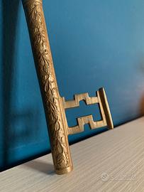 Questo oggetto è un apribottiglie vintage in ottone a forma di chiave, caratterizzato da incisioni floreali e una lavorazione artigianale. Materiale: Ottone lavorato. Design: Forma a chiave antica con decorazioni a rilievo. Funzione: Apribottiglie per tappi a corona. Stile: Vintage/Rustico Centimetri: circa 20cm
