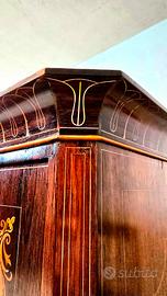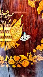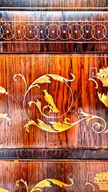 Gli intarsi in acero, con motivi floreali e ornitologici, sono impreziositi da sfumature realizzate a mano con inchiostri naturali e brunitura a caldo, una tecnica antica che dona profondità e raffinatezza. Completano il mobile le chiavi originali in ottone e ferro battuto e un elegante piano in marmo bianco di Carrara.