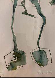 Linee fluide e macchie acquerellate creano una composizione dinamica e spontanea, con tratti grafici tipici dell’artista.
