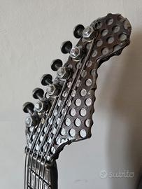 Vendo chitarra decorativa modello simile stratocaster, interamente in metallo, fatta a mano. Molte ore di lavoro, materiali, pezzi di officina meccanica e ferramenta. Ideale per decorare bar o pub, da appendere o tenere su un portachitarra come in foto, anche per decorare appartamento per appassionati del genere o stile. Peso 9 kg Altezza 1 metro circa Le dimensioni sono state realizzate più fedelemente possibile alla chitarra originale. Solo se realmente interessati o intenditori, no perditempo. Valuto offerte.
